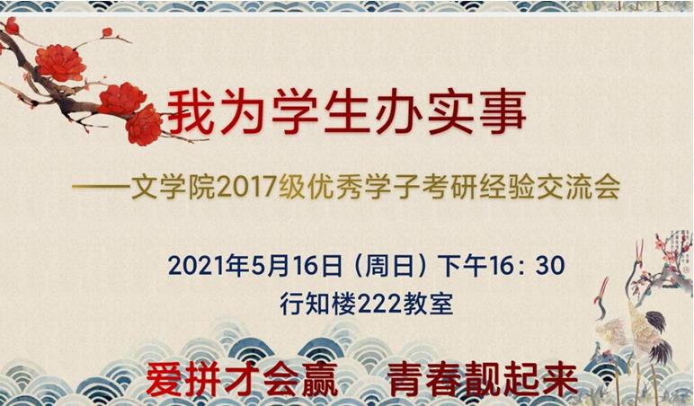 2021年5月16日,汉语言文学系、汉语国际教育系、秘书系共同策划的“太阳成集团tyc151cc2017级优秀学子考研经验交流会”在行知楼222教室举行,会议的主题是:“爱拼才会赢,青春靓起来”。