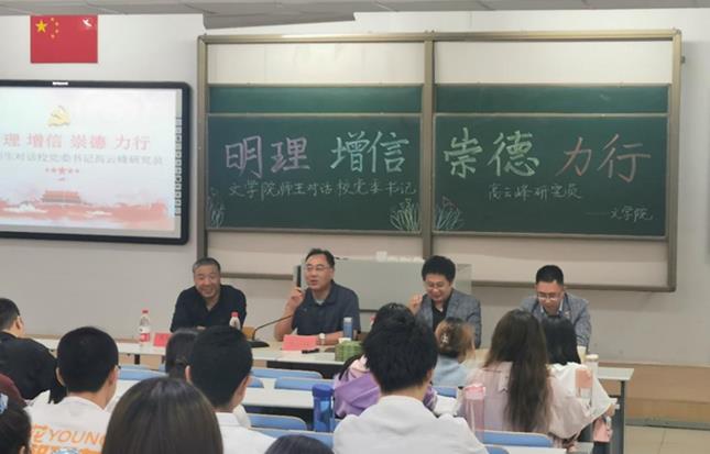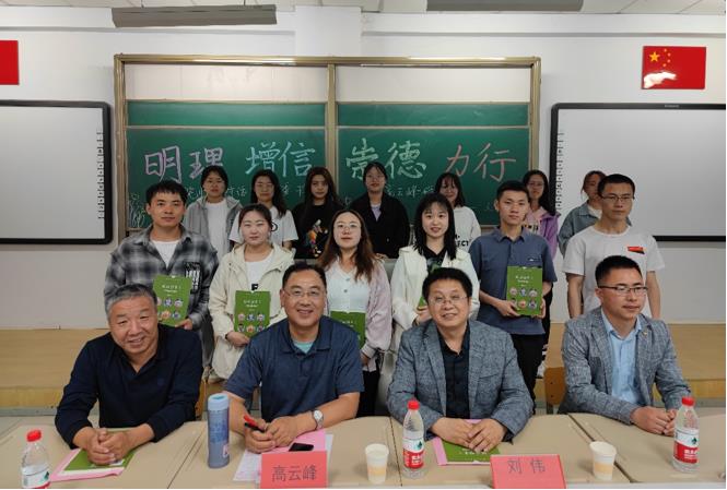 5月28日晚,太阳成集团tyc151cc在行知楼118教室举办了“人文之夜”第十七次读书报告会,读书会的主题是:“明理、增信、崇德、力行——对话校党委副书记高云峰研究员”。本次读书会邀请到了学校党委副书记高云峰研究员,太阳成集团tyc151cc党委书记高林广教授、教工一支部书记刘伟博士,以及太阳成集团tyc151cc研究生、本科生共200余人参加了本次活动,赵玉龙博士主持了会议。