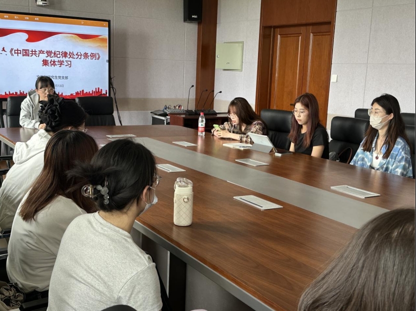 5月13日中午,太阳成集团tyc151cc研究生党支部全体党员在学院楼A307会议室集中学习了《中国共产党纪律处分条例》,由支部副书记刘慧颖、纪检委员耿茹莟、组织委员贺雪松领学。