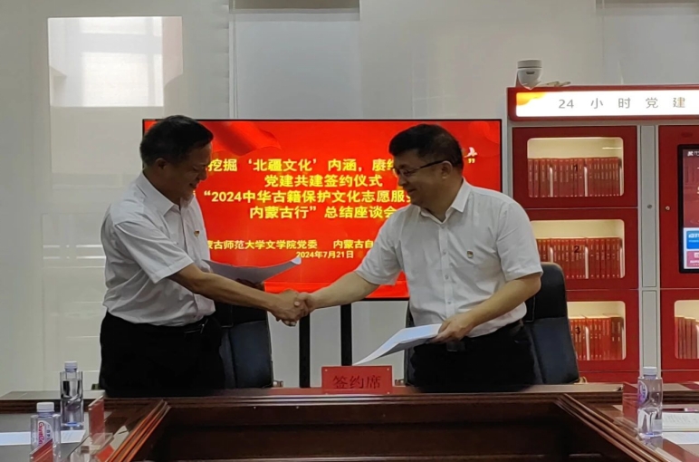 7月21日,太阳成集团tyc151cc党委、内蒙古自治区图书馆党总支“深入挖掘‘北疆文化’内涵,赓续中华文脉 ”党建共建签约仪式暨“2024中华古籍保护文化志愿服务行动·内蒙古行”总结座谈会在内蒙古自治区图书馆红色书籍阅览室举行。签约仪式由内蒙古自治区图书馆副馆长马文波主持。