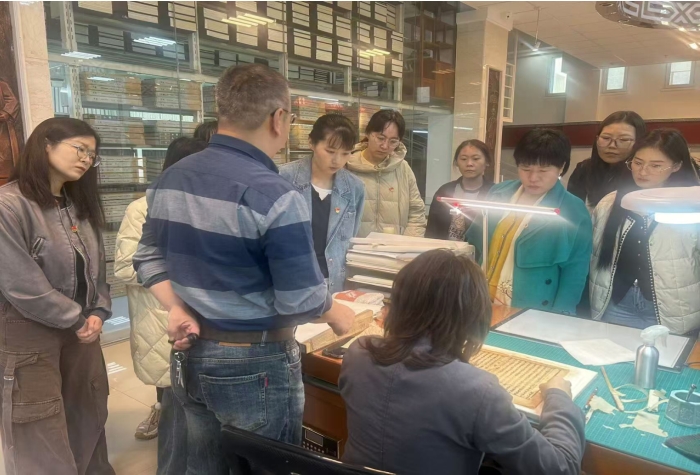 全体党员首先参观了“铸牢中华民族共同体意识蒙古文古籍展”,在讲解员的讲解下,党员们多角度、多维度认识古籍中的民族团结进步思想。随后参观古籍修复室,进一步了解如何利用和保护古籍,学习古籍装帧、修复等相关知识。