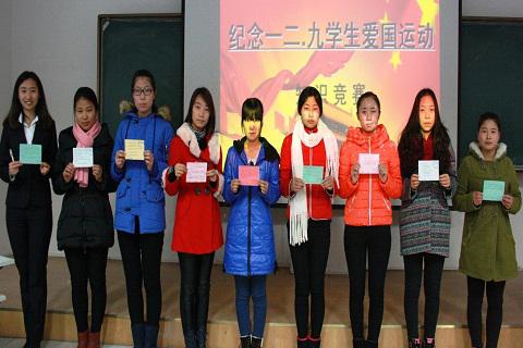 为迎接“一二·九”运动80周年纪念日,12月6日晚七时,我院在盛乐校区行知楼举办了“纪念一二·九学生爱国运动”主题知识竞赛。