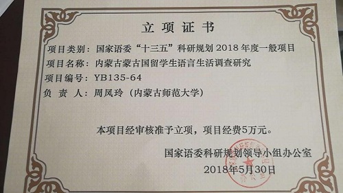 近日,国家语委发布“十三五”科研规划2018年度一般项目名单,我院周凤玲博士的“内蒙古蒙古国留学生语言生活调查研究”成功获批。这是我院近年来注重整合科研力量,凝练科研方向,不断加大科研投入,积极鼓励青年教师申报各类科研项目的结果,也充分体现了学院青年教师在语言学方面的科研实力。