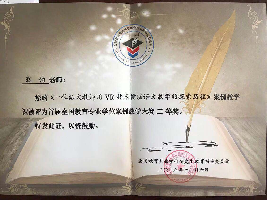 2018年11月6日,由教育部学位与研究生教育中心、全国教育专业学位研究生教育指导委员会联合主办,西南大学承办的首届全国教育专业学位案例教学大赛在西南大学落下帷幕,我院教师张钧博士的案例教学课《一位语文教师用VR技术辅助语文教学的探索历程》获得本次案例教学大赛二等奖。
