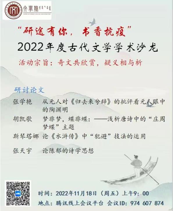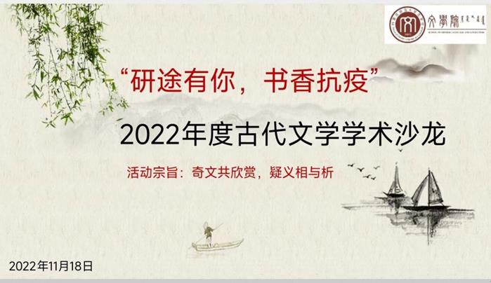 独学而无友,则孤陋而寡闻。勤学而交流,则博学而睿智。2022年11月18日上午,我院中国古代文学学位点成功举办了主题为“研途有你,书香抗疫”的2022年度古代文学学术沙龙。古代文学硕士点的高林广、陆有富、石海光、付希亮、刘伟、张丽杰6位导师和高国庆、赵玉龙、马奥远等古代文学课教师以及学位点的全体研究生共40余名师生参加了本次学术沙龙活动。受新冠疫情影响,本次学术沙龙采取线上方式进行。