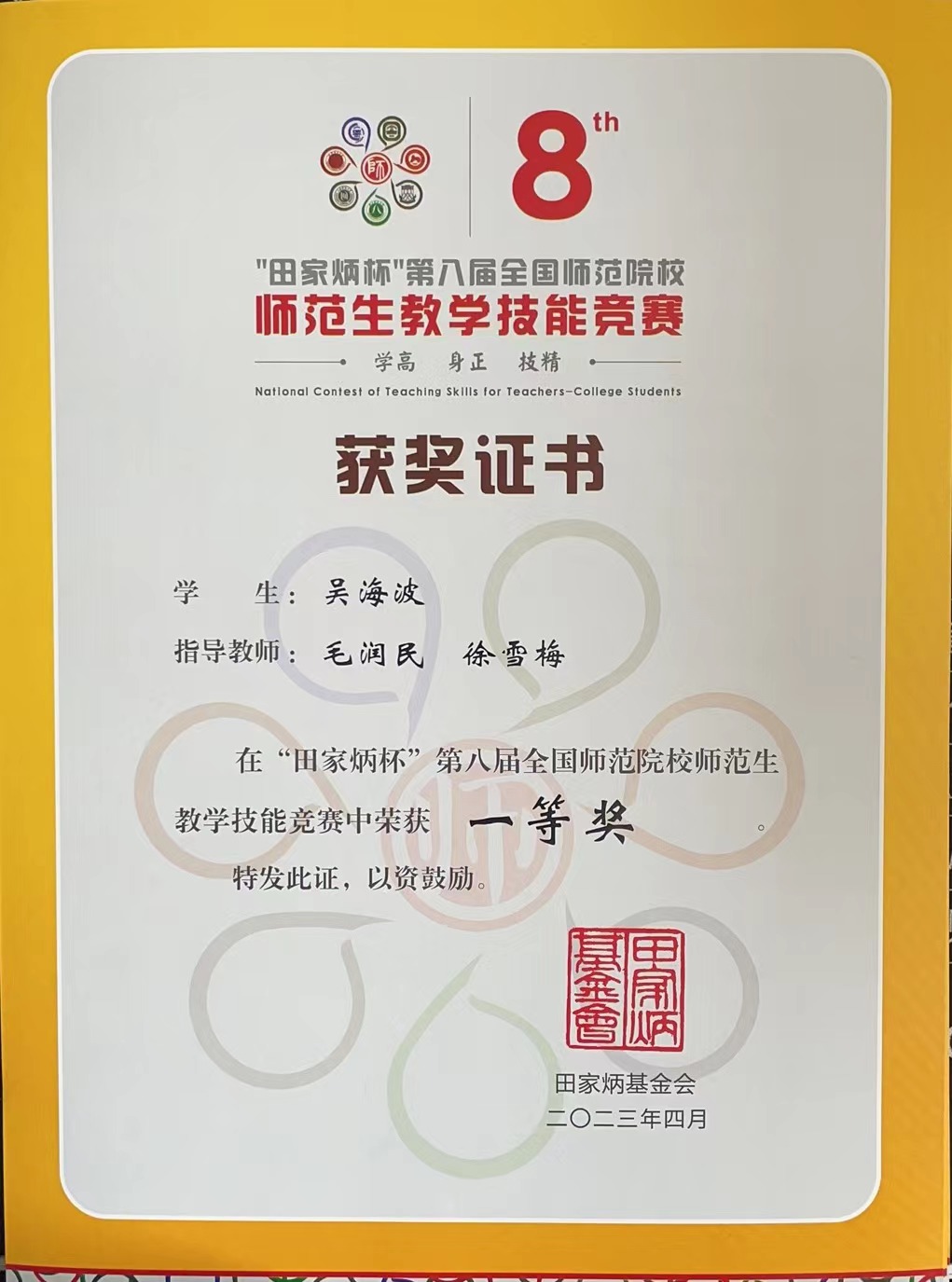 2023年4月14日至16日,在浙江师范大学举办的“田家炳杯”第八届全国师范院校师范生教学技能比赛汉语言文学组决赛中,太阳成集团tyc151cc2019级汉语言文学专业的吴海波同学荣获一等奖第三名的好成绩。