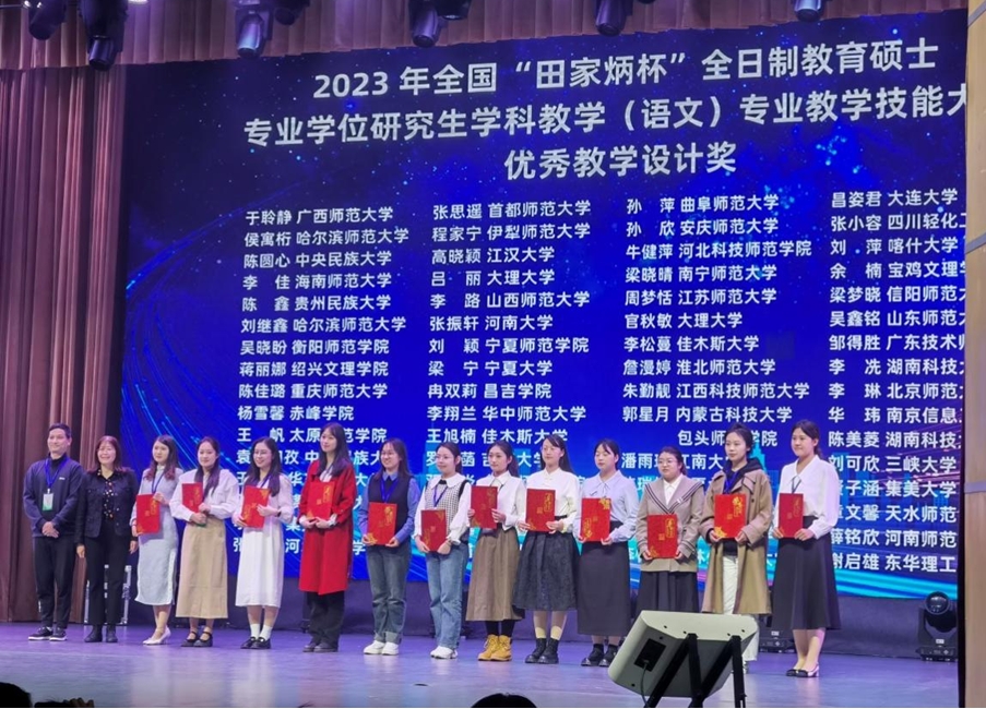 来自全国107所院校的499名选手参加初赛,通过遴选,153名选手进入最后的决赛。我院选派2022级学科教学(语文)的韩娟、王越两位同学参赛,两位同学凭借扎实的教学基本功,在比赛中脱颖而出,韩娟荣获二等奖,王越荣获优秀教学设计奖,刘伟老师荣获“优秀指导教师”奖。