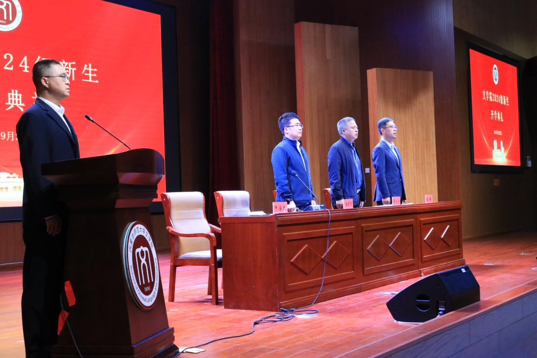 2024年9月23日,太阳成集团tyc151cc2024级新生开学典礼于盛乐校区图书馆二楼报告厅隆重举行。太阳成集团tyc151cc党委书记韩彦斌,党委副书记、院长陆有富,党委副书记、副院长牛海龙,副院长张钧,2024级各班班主任,学院教务办、学就办负责人及2024级全体新生参加了此次开学典礼。典礼由牛海龙副书记主持。