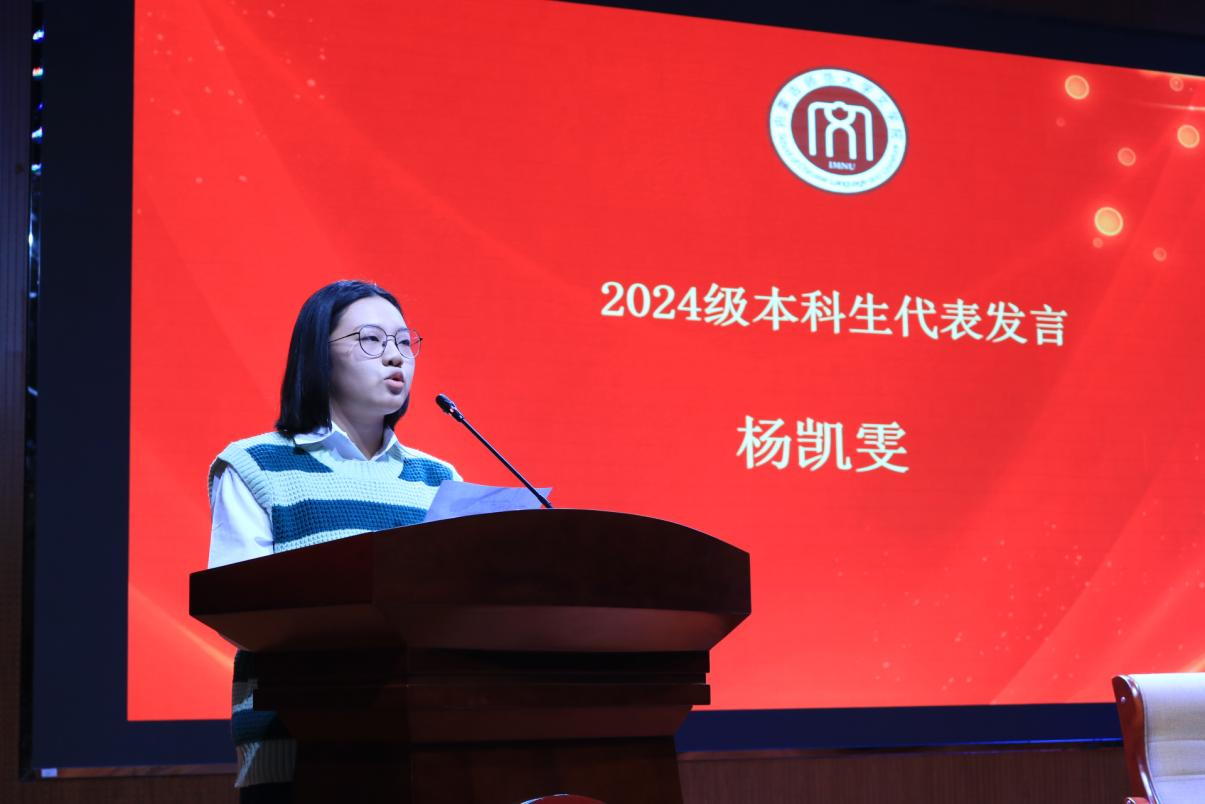 典礼第三项,本科生新生代表——2024级汉语言文学公费师范生一班学生杨凯雯发言。行至大学这一崭新起点,她表达了对未来生活的憧憬和期许。此外,她表示作为师范生理应承担起“学高为师、身正为范”的责任担当,在太阳成集团tyc151cc的沃土上汲取知识和力量,虚心求教,久久为功,赓续前行。