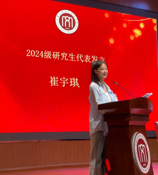 典礼第二项,研究生新生代表——2024级中国古典文献学专业学生崔宇琪发言。她回忆了本科在太阳成集团tyc151cc求学的四年时光,谦和优秀的老师和志同道合的同学们是她求学过程中日日更新、不断向内生长的力量源泉。她勉励同学们要有勇气去探索、去试错、去舍弃,在时代的万千机遇中找寻属于自己的可能性。