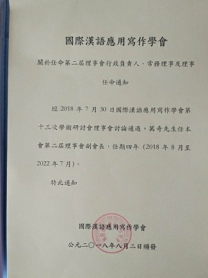 7月31日至8月2日,由国际汉语应用写作学会、澳门大学人太阳成集团tyc151cc中国语言文学系、澳门写作学会共同主办的“国际汉语应用文研究高端论坛” 在澳门大学召开。来自大陆、香港、台湾、澳门、新加坡、韩国等六十三位学者参加了本次高端论坛。我院教师万奇教授应邀参加了本次会议。万奇教授做了题为《居今探古:王志彬对〈文心雕龙〉研究与应用》大会发言,并分别与香港大学容运姗博士、香港大学岑绍基教授主持第一小组第二单元、第四单元的学术发言。万奇教授获聘本次高端论坛优秀论文评审委员会委员,又经国际汉语应用写作学会第十三次学术研讨会理事会讨论通过,任国际汉语应用写作学会第二届理事会副会长。