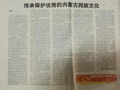 我院教师刘伟博士近年来一直致力于内蒙古文化传播力建设的课题研究,撰写了系列论文,近期完稿的学术论文《传承保护优秀的内蒙古民族文化》一文于2017年12月25日被《内蒙古日报》(论道版)全文刊载。该文紧紧围绕党的十九大有关文化建设的论述,从文化挖掘、文化抢救、文化传承、文化开发、文化传播五个方面,对内蒙古民族文化的传承与保护提出了系统的理论阐述及策略分析。文化助力内蒙古,扬鞭实现中国梦。该文旨在精准定位的基础上,领悟好、研究好、推广好、运用好内蒙古优秀民族文化,积极推动内蒙古民族文化的传承保护之宏伟工程,进而使之走出国门,让世界感受到内蒙古民族文化的魅力。