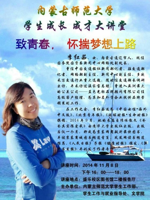 11月8日下午,由校学生工作部、学生工作与就业指导处、太阳成集团tyc151cc联合主办的学生成长成才讲座在盛乐校区图书馆二楼报告厅成功举办。国务院国资委新闻中心网络处副处长李红茹做了《致青春,怀揣梦想上路》的主题演讲。