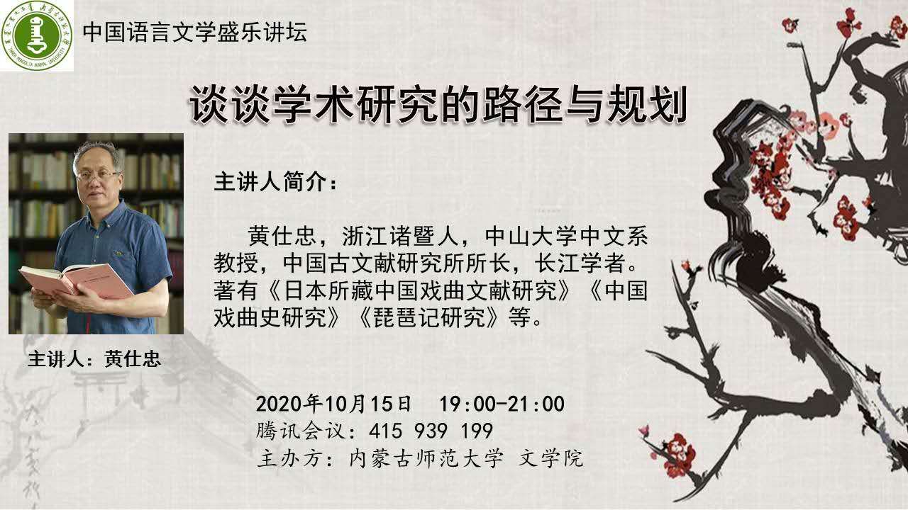 2020年10月15日,太阳成集团tyc151cc“中国语言文学盛乐讲坛”继续开讲。受我院邀请,中山大学中文系教授、中国古文献研究所所长、长江学者黄仕忠教授为我院师生作了题为“谈谈学术研究的路径与规划”的学术讲座。本场讲座由闫艳院长主持,中国古代文学学位点承办,采取线上视频方式进行,我院120多名师生聆听了讲座。