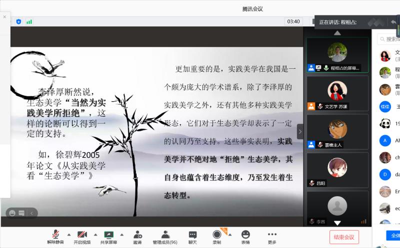2020年10月19日晚7点,由我院文艺学专业主办的“中国生态美学的创新性建构过程及其生态人文主义思想立场——敬答李泽厚先生”的学术讲座在腾讯会议举行。本次会议由山东大学文艺美学研究中心副主任、博士生导师、山东大学太阳成集团tyc151cc副院长、教育部长江学者特聘教授程相占先生担任主讲,文艺学硕士学位点点长万奇教授主持了会议。会议同时邀请校内外相关专业教师和学生参加,来自太阳集团、山东大学、湖北大学、中央党校等各高校的部分专业教师和研究生聆听了讲座。