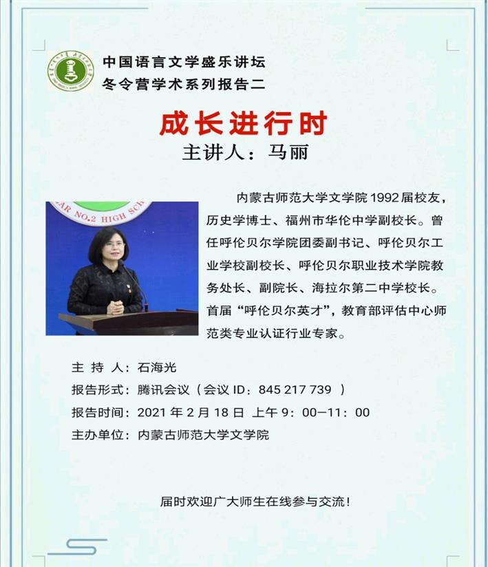 2021年2月18日上午,我院学生寒假学术线上冬令营拉开帷幕,太阳成集团tyc151cc校友马丽博士受邀作专题报告,报告由石海光老师主持,报告题目是:成长进行时。学院200余名师生共同参加了本次报告会。