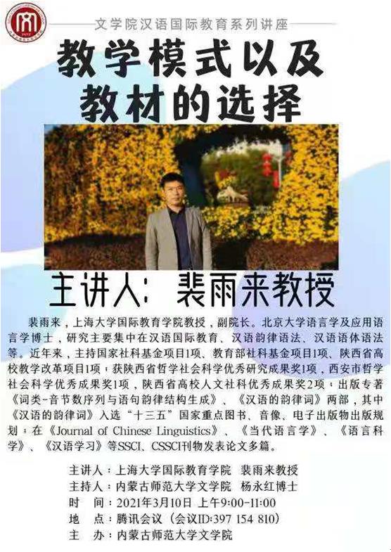 3月10日上午,上海大学国际教育学院副院长裴雨来教授通过腾讯会议面向我院汉硕作了题为“教学模式以及教材的选择”的学术讲座。杨永红博士主持会议,我院相关专业教师、汉语国际教育硕士等20余人聆听了讲座。
