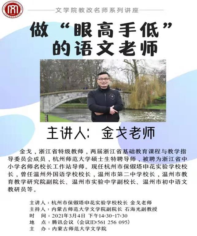 3月4日下午,杭州保俶塔申花实验学校校长金戈为我院特岗学员与语文教育硕士做题为《做“眼高手低”的语文老师》的学术讲座。石海光副院长主持了会议。