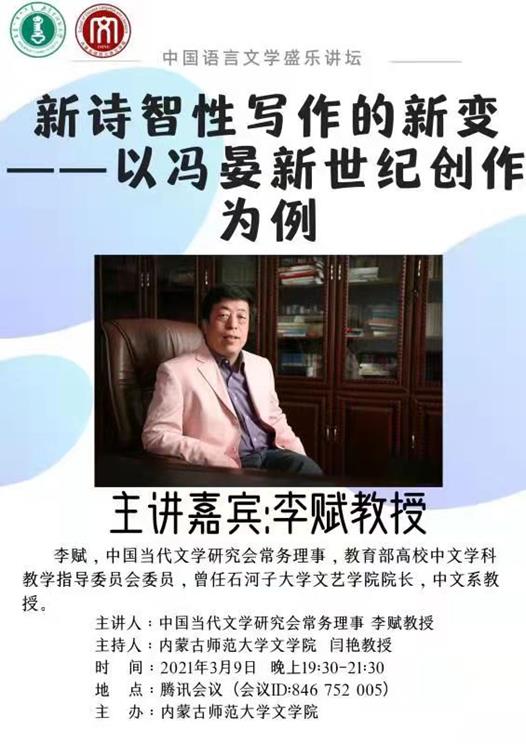 3月9日,应我院邀请,教育部高校中文学科教学指导委员会委员、中国当代文学研究会常务理事李赋教授为我院师生作了题为“新诗智性写作的新变——以冯晏新世纪创作为例”的学术讲座。本场讲座由闫艳院长主持,我院百余名师生聆听了讲座。著名诗人冯晏女士也亲临讲座现场,与我院广大师生亲切互动。
