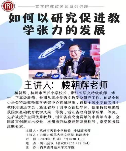 2021年3月3日上午,杭州市天长小学校长楼朝辉为特岗培训教师和太阳成集团tyc151cc学科语文、汉语国际教育硕士专业研究生作了精彩学术讲座,讲座的主题是:以研促教;基础教育青年教师发展的有效路径。我院学科教学(语文)硕士点点长孙静博士主持了会议。