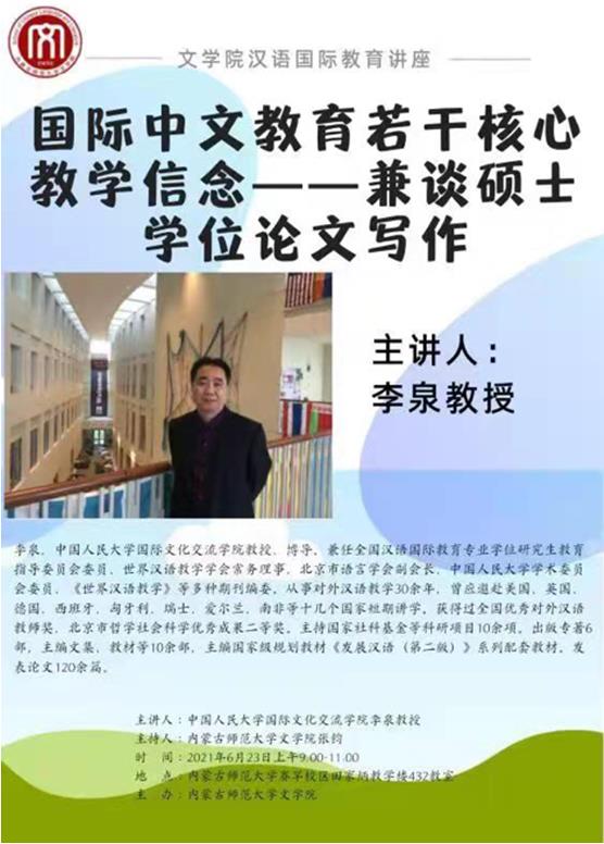 2021年6月23日,应我院邀请,全国汉语国际教育专业学位研究生教育指导委员会委员、世界汉语教学学会常务理事、中国人民大学国际交流学院李泉教授为我院师生作了题为“国际中文教育若干核心教学信念——兼谈硕士学位论文写作”的学术讲座。本次讲座的地点为赛罕校区田家炳教育书院432多媒体教室,由太阳成集团tyc151cc院长张钧教授主持,汉语国际教育、学科教学(语文)等专业的教师和硕士研究生40余人聆听了讲座。