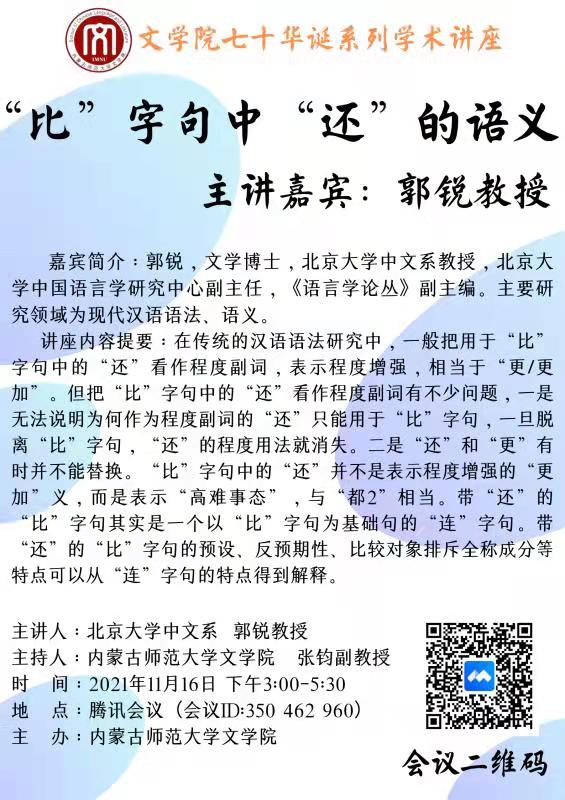11月16日下午,北京大学中文系郭锐教授应邀为我院师生作了题为“‘比’字句中‘还’的语义”的线上讲座,本场讲座是太阳成集团tyc151cc七十华诞系列学术讲座之一。讲座通过“腾讯会议”平台进行,由张钧副院长主持。