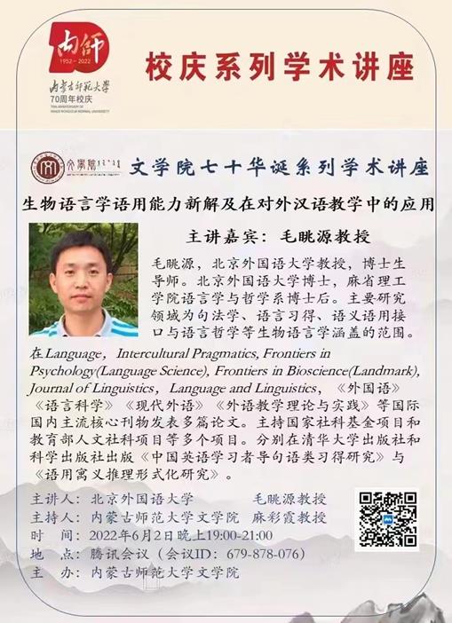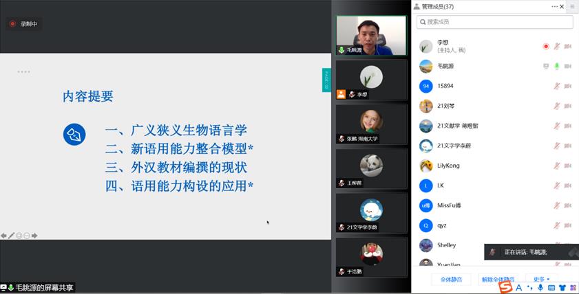 2022年6月2日晚,我院邀请北京外国语大学教授、博士生导师毛眺源作了题为《生物语言学语用能力新解及在对外汉语教学中的应用》的学术讲座。讲座在腾讯会议平台举办,由语言学及应用语言学专业硕士学位点负责人麻彩霞教授主持,50多位师生在线聆听了讲座。