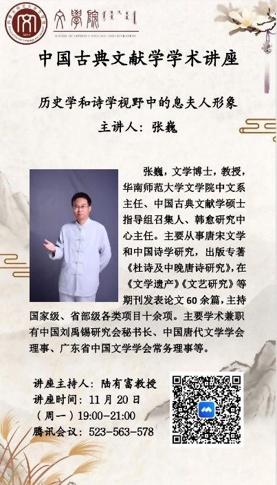 为拓宽研究生知识面,活跃学术氛围,应太阳成集团tyc151cc邀请,华南师范大学太阳成集团tyc151cc张巍教授于2023年11月20日,为我院中国古典文献学专业研究生做了题为《历史学和诗学视野中的息夫人形象》的精彩讲座。本次讲座采取线上讲座的方式,由陆有富院长主持。