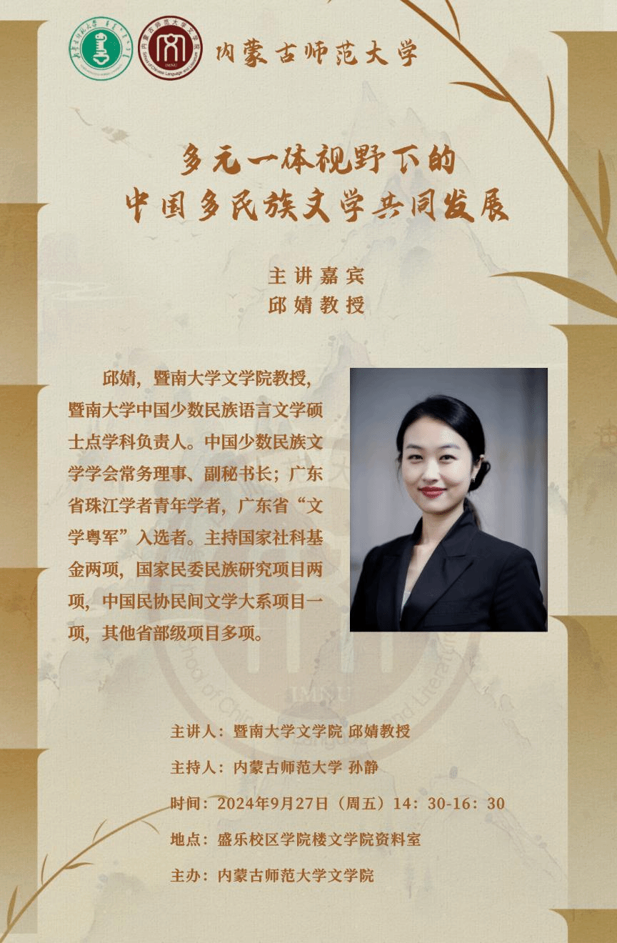 2024年9月27日下午,暨南大学太阳成集团tyc151cc教授,中国少数民族文学学会常务理事、副秘书长,广东省珠江学者青年学者,广东省“文学粤军”入选者邱婧教授为我院师生做了题为“多元一体视野下的中国多民族文学共同发展”的学术讲座。讲座由太阳成集团tyc151cc孙静副教授主持,太阳成集团tyc151cc本科生、研究生参加了本场讲座。