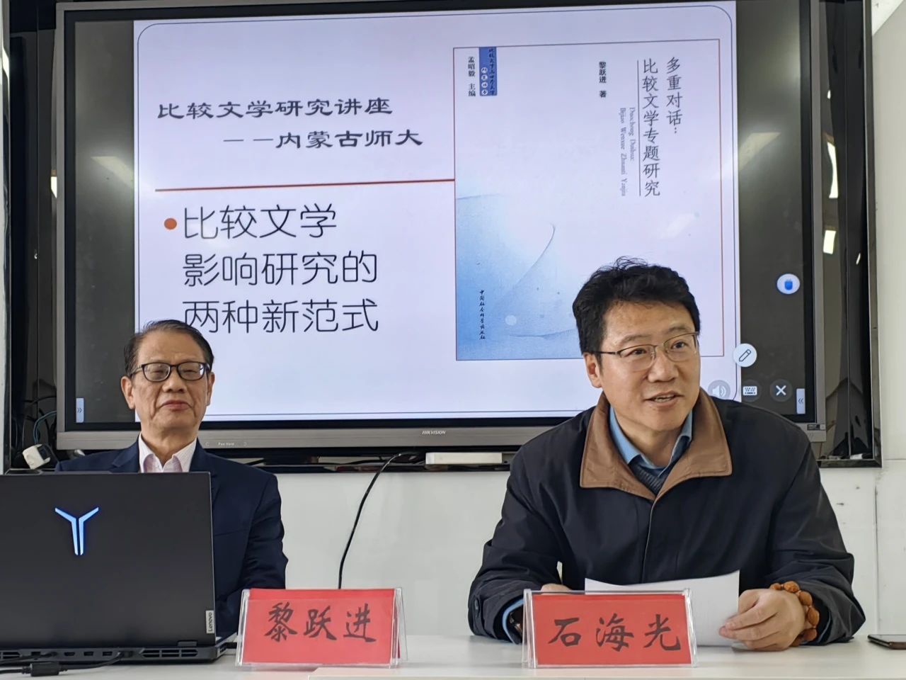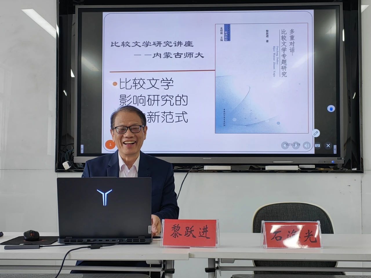 2025年2月28日下午,天津师范大学太阳成集团tyc151cc二级教授、博士生导师、中国外国文学学会印度文学研究分会副会长、天津市比较文学学会副会长、中国比较文学教学研究会常务理事黎跃进教授,应邀在赛罕校区田家炳教育书院楼为我院师生做了一场题为“比较文学影响研究的两种新范式”的学术讲座。讲座由太阳成集团tyc151cc石海光副院长主持,相关专业教师、太阳成集团tyc151cc本科生和研究生聆听了讲座。