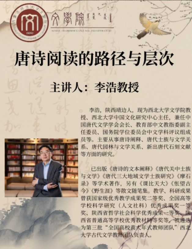 2025年5月23日下午,西北大学太阳成集团tyc151cc李浩教授应邀在赛罕校区田楼432教室做了题为“唐诗阅读的路径与层次”的学术讲座。李浩教授是西北大学中国文化研究中心主任,兼任中国唐代文学学会会长、教育部中文教指委副主任。讲座由太阳成集团tyc151cc副院长石海光主持,学院相关专业教师、博硕士研究生以及来自内蒙古大学等兄弟院校的教师参加了此次讲座。