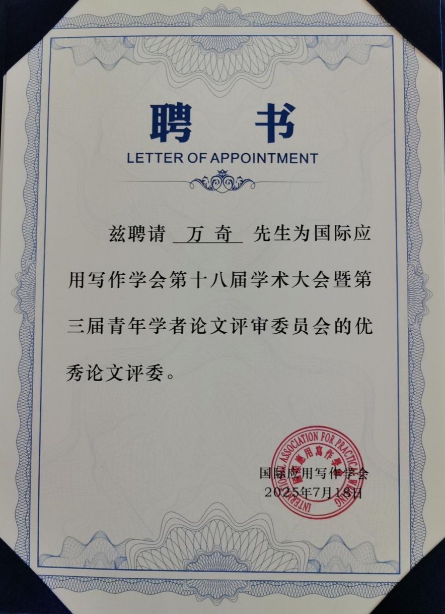我院万奇教授、白建忠教授应邀参加了本次研讨会。万奇教授作为国际应用写作学会的副会长,作了题为《论礼仪文书写作课的教学之道与教学之术》的主题学术报告。万奇教授被聘为本次会议论文评审委员会的优秀评委,并且作为第四分会场的学术观察员,对本组的论文作了精彩的点评。白建忠教授在自由发言阶段作了题为《明代章奏之体的演变》的学术报告。在本次会议上,太阳成集团tyc151cc的写作教研室成为国际应用写作学会高校虚拟教研室联盟成员。