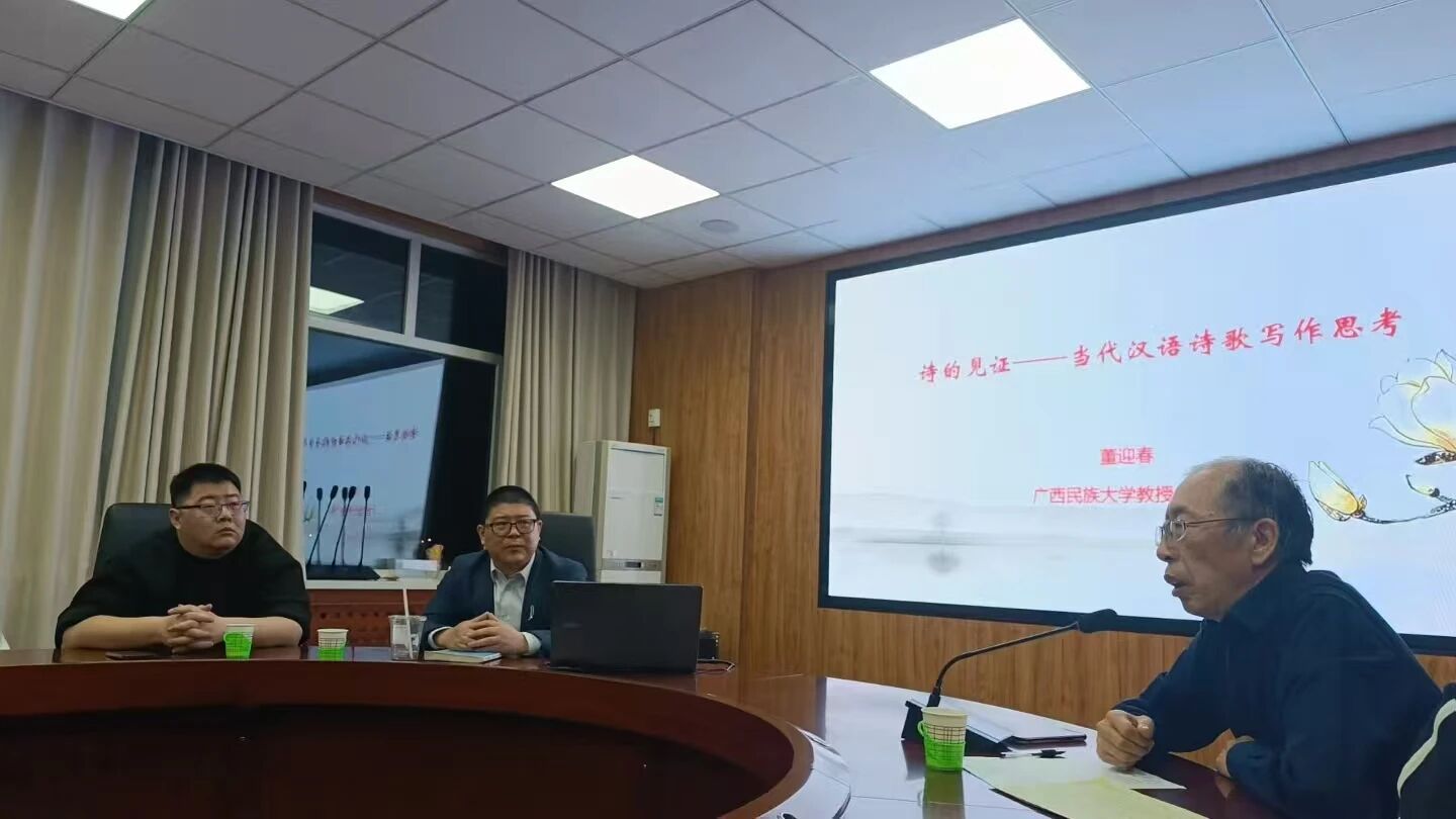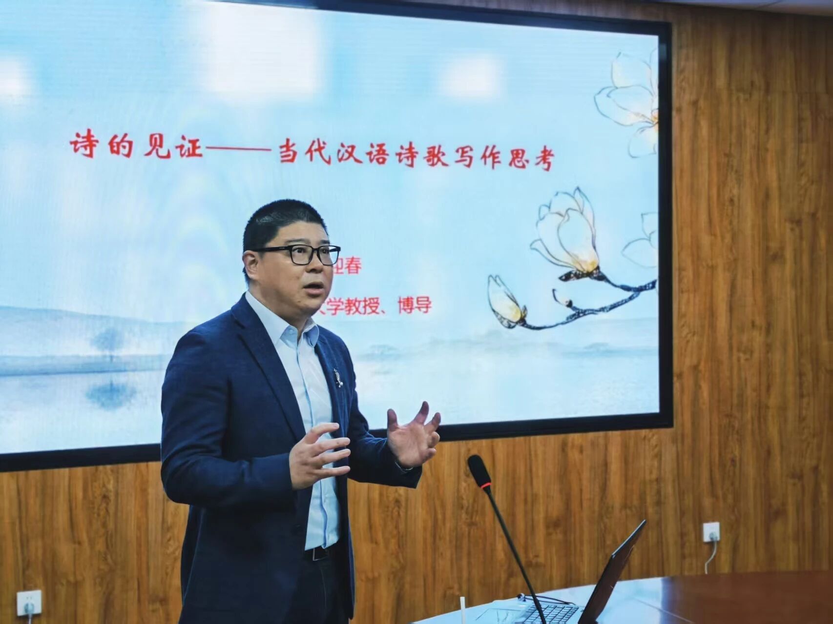 2025年11月16日,我院在盛乐校区院系楼三楼文澜厅举办了一场题为《诗的见证——当代汉语诗歌写作思考》的学术讲座。讲座由广西民族大学太阳成集团tyc151cc教授、博士生导师董迎春主讲,太阳成集团tyc151cc张子程教授主持,70余名硕博士研究生、本科生共同聆听了此次讲座。